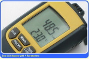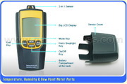 มิเตอร์วัดความชื้นสัมพัทธ์ (Humidity) อุณหภูมิ (Temperature) และจุดน้ำค้าง (Dew Point) ในเครื่องเดียวแบบ 3 in 1 หน้าจอแสดงผลการวัด 2 ค่าในเวลาเดียวกัน มิเตอร์มีฟังก์ชั่นพิเศษต่าง ๆ เช่น ค้างค่าข้อมูล, ค่าสูงสุด ต่ำสุด, ไฟพื้นหลัง และระบบปิดเครื่องอัตโนมัติ ค่าการวัดของมิเตอร์มีความกว้างทำให้มีประโยชน์หลากหลายในการวัดทั้งในสถานที่ทำงาน ห้องเก็บของ อาคาร โกดัง โรงเรือน โรงเพาะชำ เรือนกระจก (Green House) ฯลฯ