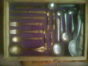 ขายชุดช้อนซ้อมทองเหลือเก่า พร้อมกล่องไม้โชว์
