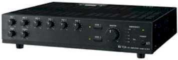 Mixer Power Amplifiers 30W A-1803 (30W): Multi-purpose, multi-function mixer/power amplifiers specifically designed for maximum versatility and cost-effective high-performance are ideal units for any PA requirement in locations such as schools and offices and other intermediate size environments. A choice of different power outputs are offered as well as functions such as paging and dual zone coverage. Specification Power Source AC mains 50/60Hz, or 24V DC (M4 screw terminal) Output 30W Power Consumption AC operation: 80W (rated output), 37W (EN60065) 24V DC operation: 2.0A (rated output), 1.0A (EN60065) Frequency Response 50 - 20,000Hz ±3dB Distortion Under 2% at 1kHz, rated power Input MIC 1: -60dB*, 600Ω, electronically-balanced, combined type of XLR-3-31 equivalent and phone jack DIN socket (5 pins) MIC 2, 3: -60dB(*1), 600Ω, electronically-balanced, combined type of XLR-3-31 equivalent and phone jack AUX 1(MOH): -20dB*, 10kΩ, unbalanced RCA pin jack AUX 2: -20dB(*1), 10kΩ, unbalanced, RCA pin jack AUX 3: -20dB(*1), 10kΩ, unbalanced, RCA pin jack combined type of XLR-3-31 and phone jack TEL(*2): -20dB*1, 10kΩ, electronically-balanced, M3 screw terminal Output REC: 0dB(*1), 600Ω, unbalanced, RCA pin jack LINE 1,2(*3): 0dB(*1), 600Ω, unbalanced, RCA pin jack MOH: 0dB(*1), 600Ω transformer balanced, M3 screw terminal SPEAKER SELECTOR: 2 zone, high impedance (100V line/330Ω), individual selector switch, M4 screw terminal DIRECT SPEAKER OUT: High impedance (100V line/330Ω),M4 screw terminal Low impedance (4 - 16Ω), M4 screw terminal (Both Low and High impedance terminals cannot be used at the same time.) Phantom Power ON or OFF for each MIC 1 - 3 with switch setting S/N ratio (Band Pass: 20 - 20,000Hz) Over 100dB (Master volume: min) Over 76dB (Master volume: max) Over 60dB (MIC 1 - 3)) Over 76dB (AUX 1 - 3) Over 90dB (TEL) Over 96dB (EMERGENCY) Control Input Bass: ±10dB at 100Hz, Treble: ±10dB at 10kHz TEL: No-voltage make contact input, open voltage: 24V DC, short-circuit: under 5mA, M3 screw terminal EMERGENCY (*4): No-voltage make contact input, open voltage: 24V DC, short-circuit: under 10mA, M3 screw terminal Control Output Power remote: Open collector output, withstand voltage: 35V DC, control current: under 50mA, M3 screw terminal Indicator 5 point LED output level meter, Power indicator LED, Zone indicator LED, Emergency LED, TEL LED Priority EMERGENCY: Overrides other inputs TEL: Overrides other inputs except “EMERGENCY”, ON/OFF selectable with switch setting MIC 1: Overrides other inputs except “EMERGENCY & TEL”, ON/OFF selectable with switch setting