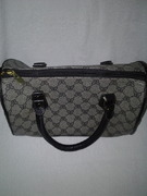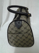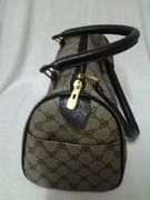 กระเป๋าถือสุภาพสตรี ทรงโบว์ลิ่ง สีน้ำตาล ลายเก๋ มือสอง สภาพดี ขายราคาไม่แพง ด้านบนมีซิปปิดเปิดกระเป๋า
