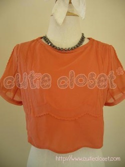 เสื้อ crop ผ้าวิ้งๆ ตัวนี้แพทเทิร์นน่ารักมากๆ ค่ะ style แบรนด์ดัง ตกแต่ง scallop ช่วงคอ ช่วงอก และด้านหลัง ตัวเสื้อจะเป็นผ้าสองชั้นไม่โป๊ค่ะ ช่วงแขนโปร่งจับจีบ ใส่กับกางเกงเอวสูงหรือ riding pants, disco pants สีดำ เก๋มากๆ ค่ะ สีนี้ใส่แล้วขับผิว แนะนำค่ะ อก ยืดได้ถึง 40" ยาว 16" http://www.cutiecloset.com/Products/productdetails.asp?category_id=1&product_id=200812324