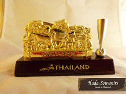 ที่เสียบปากกาและนามบัตร ช้างสีทอง ชิ้นงานทำจากโลหะเนื้อดี และฐานทำจากไฟเบอร์แข็ง ส่วนสีแดงตรงคำว่า Thailand เป็นแสงสท้อนจากผ้าสีแดงที่เราใช้ถ่าย (มีฝีมือถ่ายแค่นี้ แหะๆ) ส่วนไต้ฐานนั้นบุกำมะหยี่สีดำอย่างดี สำหรับเจ้านายที่แสนใจดี หรือหัวหน้าที่รักลูกน้องทุกท่านที่กำลังอยากจะให้ของขวัญพนักงานเพื่อรักษามิตรไมตรี และความสมามัคคีร่วมกันในการทำงาน ลองแวะมาดูเว็บไซต์ของเรานะค่ะ