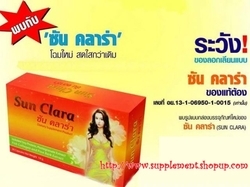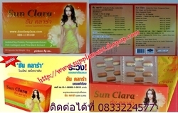 ผลิตภัณฑ์เสริมอาหารซันคลาร่า อาหารเสริม สำหรับผู้หญิง วิธีการรับประทาน รับประทานครั้งละ 1 แคปซูล ก่อนนอน น้ำ้หนักเกิน 55 กก. 2 แคปซูล ก่อนนอน ขนาดบรรจุ ใน 1 กล่องประกอบด้วย ซันคลาร่าจำนวน 2 แผง แผงละ 15 แคปซูล บรรจุชีลล์อย่างดี อย.เลขที่ 13-1-06950-1-0015 ส่วนประกอบสำคัญ โปรตีนสกัดจากถั่วเหลือง 34.67% สารสกัดจากทับทิม 15.00%คอลลาเจนจากปลา 13.67% สารสกัดจากเปลือกสน 8.83% Alpha Lipoic Acid 6.16% สารสกัดจากชาเขียว 5.00% แคปซูล16.67% สารอาหารเหล่านี้ออกฤทธิ์ กระตุ้นการ สร้างฮอร์โมนเพศ ควบคุมฮอร์โมนจากต่อมไร้ท่อ ที่ควบคุมระบบการทำงานทุกส่วนของร่างกาย ส่วนประกอบที่สำคัญ มีประโยชน์ ดังนี้ โปรตีนสกัดจากถั่วเหลือง มีฤทธิ์แก้ปวดประจำเดือน ช่วยให้รอบเดือนปกติ ลด อาการสวิงสวายในสตรีวัยทอง,รักษาระดับน้ำตาล, แก้อาการตะคริวที่กล้ามเนื้อขา, ทำให้ช่องคลอดมีน้ำเมือกหล่อลื่น,เสริมโครงสร้างกระดูกและเนื้อเยื่อคอลลา เจน สารสกัดจากทับทิม มีสิทธิภาพในการป้องกันอนุมูลอิสระสูง, ช่วยให้เลือดไหลเวียนดี คอลลาเจน เป็นโปรตีนที่ทำใหเกิดความสปริงตัวของผิวหนัง ให้ผิวเต่งตึง เรียบเนียน กระชับ สารสกัดจากเปลือกสน ช่วยให้ผนังเส้นเลือดโดยเฉพาะเส้นเลือดดำ(Veins)มีความแข็งแรงเพิ่มขึ้น กรดอัลฟ่าไลโปอิค เป็น สารจำเป็นของร่างกาย สำหรับการต่อต้านอนุมูลอิสระ เพราะเมื่อรับประทานเข้าไปกรดนี้จะถูกเปลี่ยนเป็นกลูต้าไธโอน ทำให้ร่างกายสามารถยับยั้งการเกิดอนุมูลอิสระทำให้ผิวขาวสว่างขึ้นด้วย สารสกัดจากชาเขียว ลดความเสี่ยงต่อโรคหัวใจและหลอดเลือด, ป้องกันเบาหวาน, ช่วยให้น้ำหนักลดลง, ป้องกันความผิดปกติของผิวหนัง, ป้องกันโรคParkinsonและAlzheime