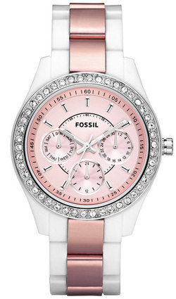 นาฬิกาข้อมือผู้หญิง FOSSIL รุ่น STELLA MULTIFUNCTION PINK DIAL WATCH หน้าปัดสีชมพู มีเพชรล้อมรอบ สายเป็นพลาสติกสีขาว คาดด้วยสีทองแดง สวยน่ารักค่ะ ราคาลดพิเศษเพียง 3950 บาท