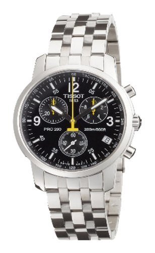 ลดราคา Tissot Men's T17158652 PRC 200 Chronograph Watch The Tissot Men's PRC 200 Chronograph Watch features three large, easy-to-read chronograph subdials and a tachymeter for enhanced functionality. Constructed with a stainless steel case, the watch includes a stationary stainless steel bezel and a stainless steel link bracelet with a secure fold-over-clasp-with-push-button. A scratch-resistant sapphire window shields the black dial face, which features bold white hour markers and Arabic numeral indexes at three, nine, and 12 o'clock. The dial also includes three chronograph subdials with vibrant yellow hands, a date calendar at four o'clock, and is encircled by a white tachymeter. Powered by Swiss-quartz movement, this timepiece is water resistant to 660 feet.