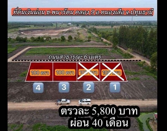 ที่ดินคลอง 9 ผ่อนได้ 40 เดือน ขนาด 100 ตรว. ราคา 580,000 บาท