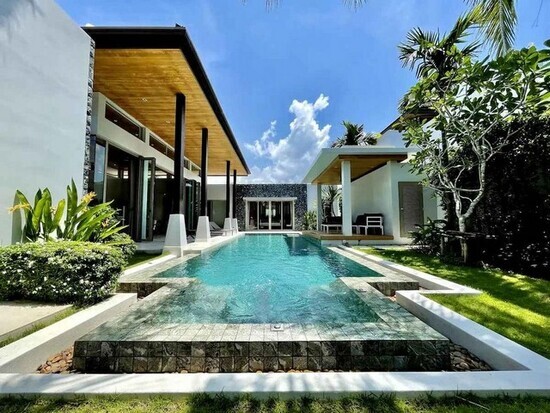 This luxurious villa spans a 600 sqm land area with a total built-up space of 410 sqm offering expansive indoor and outdoor living areas a modern kitchen and a stunning lap pool with a jacuzzi sun-beds a “Sala” and an outdoor shower and bathroom. Located within walking distance of Bangtao Beach pharmacies restaurants and supermarkets this villa combines convenience with elegance.