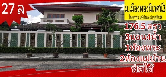 บ้านเดี่ยว 2 ชั้น เมืองทองธานีนิเวศน์ โครงการ 1 เนื้อที่ 176.50 ตร.วา พื้นที่ใช้สอยมากกว่า 600 ตร.ม. และมีห้องพระกับอีก 2 ห้องแม่บ้าน สามารถจดรถได้สูงสุด 4 คัน พื้นชั้น1ปูกระเบื้องลายหินอ่อนและไม้มะค่าในบางส่วน ชั้นบนปูพื้นไม้มะค่า ส่วนอื่นๆเป็นไม้มะค่า,ไม้แดงและไม้สักทองในการบิวท์อินท์ เครื่องปรับอากาศเป็นแบบฝังในตัวบ้านเพื่อให้ดูสวยงาม พร้อมที่จอดรถ 4 คัน โครงสร้างบ้านดีมากๆไม่มีรอยทรุดและน้ำไม่ท่วมเนื่องจากพื้นที่ดินทั้งแปลงสูงกว่าพื้นถนน การเดินทางสามารถเดินทางได้สะดวกสบายเพราะห่างจากถนนหลักแจ้งวัฒนะและทางด่วนไม่เกิน1กม.