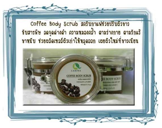 สูตรนี้สำหรับคนอยากขาว ขาวกันไปเลย ขัดผิวสัก 3-5 ครั้ง ผิวจะขาวใสขึ้นจริง ๆ ค่ะ เพราะกาแฟที่นำมาใช้เป็นกาแฟสด เกรด A ที่มีคุณภาพนำมาเป็นวัตถุดิบในการผลิต จึงปราศจากสารเคมี นอกจากนี้ยังมี และวิตามินอี ขมิ้นชัน น้ำผึ้ง เพิ่มความชุ่มชื่นให้กับเซลล์ผิว บำรุงผิวไปในตัว ช่วยลดริ้วรอย ปกป้องผิวจากอนุมูลอิสระ