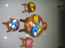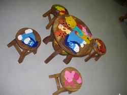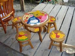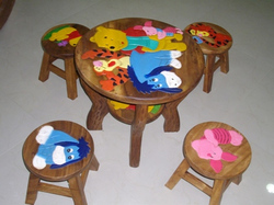 ขายชุดโต๊ะเด็กไม้แกะสลักลายการ์ตูนพร้อมเก้าอี้ 4 ตัว ทำจากไม้จริง (เป็นของใหม่) ราคาถูก
