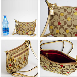 Coach F46773 Cross Body Laura Secret Admirer ของแท้ มือหนึ่ง จากอเมริกานะคะ สกรีนลายหัวใจสีแดง น่ารักมากๆ ค่ะ ตัวกระเป๋าทำจากผ้าซาตินลายซีโลโก้สี khaki แต้มหัวใจสีแดง
