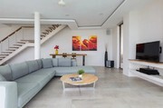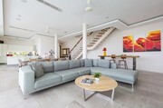 The villa is accessed from the 2nd floor carport which features 2 en-suite bedrooms both with access to a balcony and stunning sea views. The master bedroom has a bath and an outdoor lounge area. A mezzanine staircase leads down to the main living area. The spacious open-plan design features a modern western style kitchen.