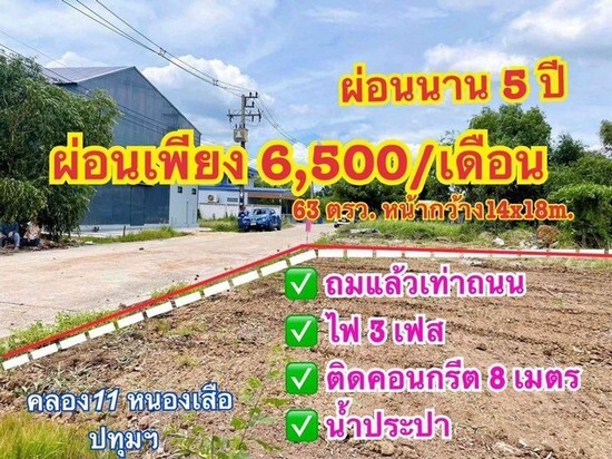 ที่ดินผ่อน หนองเสือ ขนาด 63 ตรว. น้ำและไฟฟ้ามีพร้อม ผ่อนได้นาน 5 ปี
