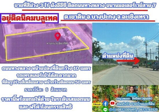 ขายที่สีม่วง 3 ไร่ ผังอีอีซี รถเทรลเลอร์เข้าได้ ต.เขาดิน อ.บางปะกง จ.ฉะเชิงเทรา