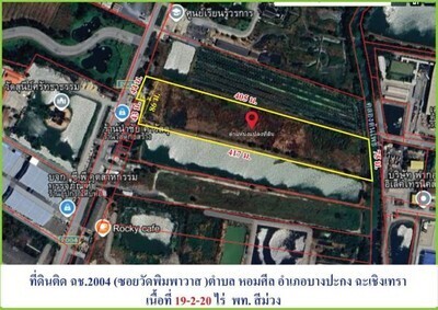 ขายที่ดินถนนบางนาตราด กม.35 ขาออก ซอยวัดพิมพาวาส เนื้อที่ 19-2-20 ไร่ ตรงข้ามสนามกอล์ฟไทย คันทรีคลับ ต.หอมศีล อ. บางปะกง ฉะเชิงเทรา
